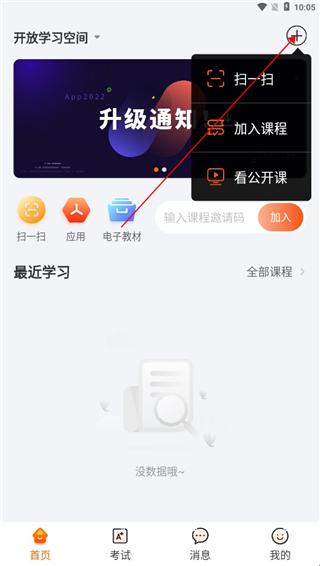4、点击右上角的加号可以进行扫一扫,加入课程,看公开课等操作。