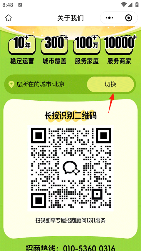 3、在跳转的小程序中切换到您所在的城市,并扫描以下二维码进行申请入驻平台。