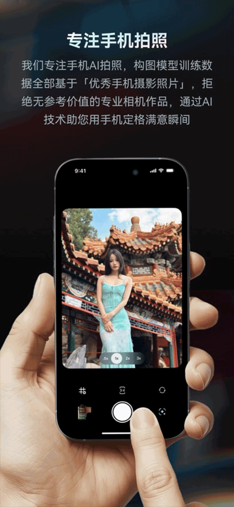 专注手机AI拍照,构图模型训练数据全部基于「优秀手机摄影照片」,拒绝无参考价值的专业相机作品,通过AI技术助您用手机定格满意瞬间。