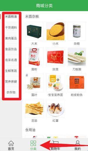 3、点击底部分类可进入商品详细分类页面,快速查找米面粮油、生鲜果蔬等乡村特色商品。