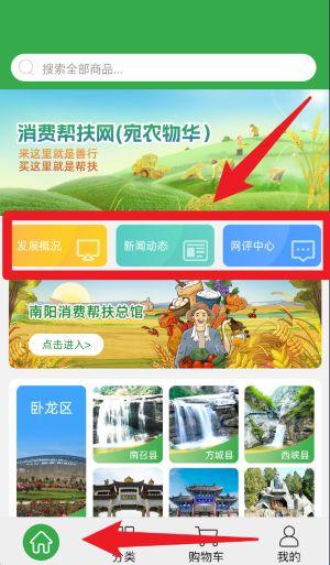 2、在首页可浏览平台推荐的帮扶商品与专区内容,同时支持查看发展概况、新闻动态与网评中心等信息。