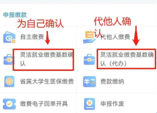 2、本人确认申报选择“灵活就业缴费基数确认”,代他人申报缴费请选择“灵活就业缴费基数确认(代办)”。