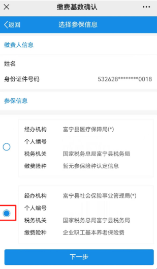 3、点击进入,输入正确的缴费人信息后,点击“下一步”,选择参保信息“缴费险种企业职工基本养老保险费”,点击“下一步”,进入“缴费基数确认”,生效年月“2026-01”,缴费基数档次选择(2026年缴费基数档次共有25个缴费档次供参保人员自主选择),在核对自己选择缴纳的档次后点击“确定”,点击“修改全部险种”,点击“确认申报”。