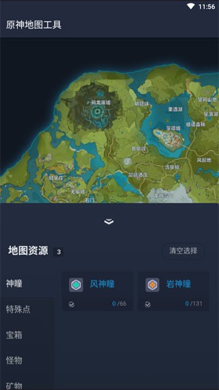 1、进入工具后默认加载工具内的特性分类,拥有风神瞳、绯红玉髓、宝箱、地灵龛等等,你还可以在页面下拉,点击选择想要的类型资源,并且还拥有特产、矿物、怪物、食材、素材等等分类可以进行查找
