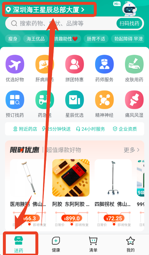 3、来到【送药】,点击上方的地址改成收货地址,这样会自动搜索地址附近的药店。