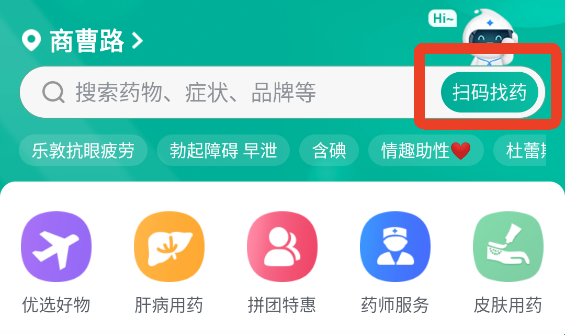 4、在上方搜索框内搜索你想要购买的药,或者扫码买药。