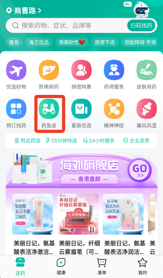 6、如果你住在大城市的核心区域,可以直接点击【买药】-【药急送】。