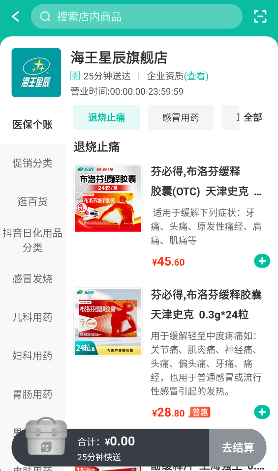 7、会自动推送离你最近的海王星辰药店,点击【+】把你需要的药品加入到购物车,点击去结算就可以了。