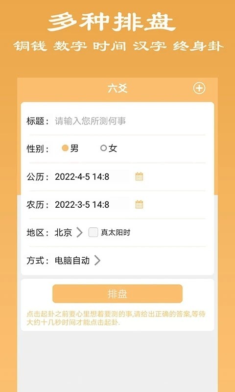 1、多种起卦方式:提供铜钱起卦、时间卦、数字卦、汉字起卦等12种起卦方式,满足不同占卜习惯。