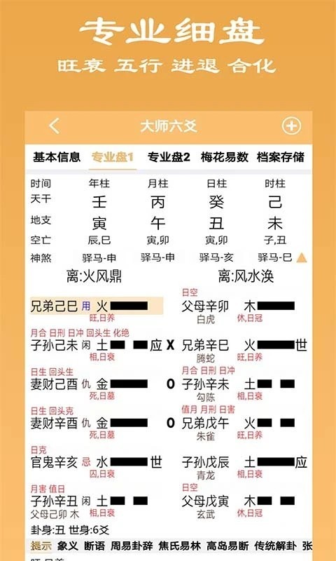 (1)专业盘1点击本卦爻,伏神,变卦爻查看提示