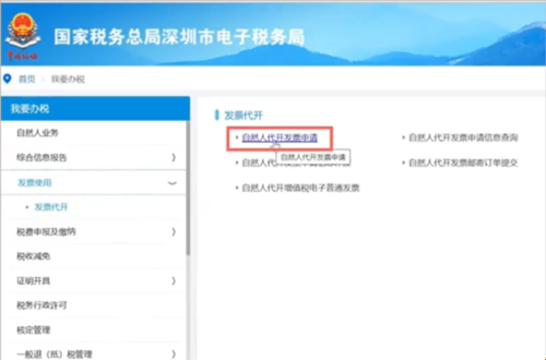 3、然后在打开的新页面中依次点击【发票代开】>>【自然人代开发票申请】