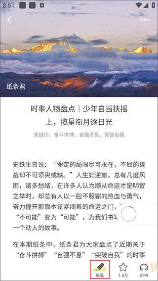 5、每日积累,定时充电:空闲时间打开纸条,每天半小时,获取比学校更广阔的视野,比杂志更全面的资讯,逐步提高自己的阅读和写作能力。跟着纸条君一起拓宽自己知识的边界,提升自己的文学素养。