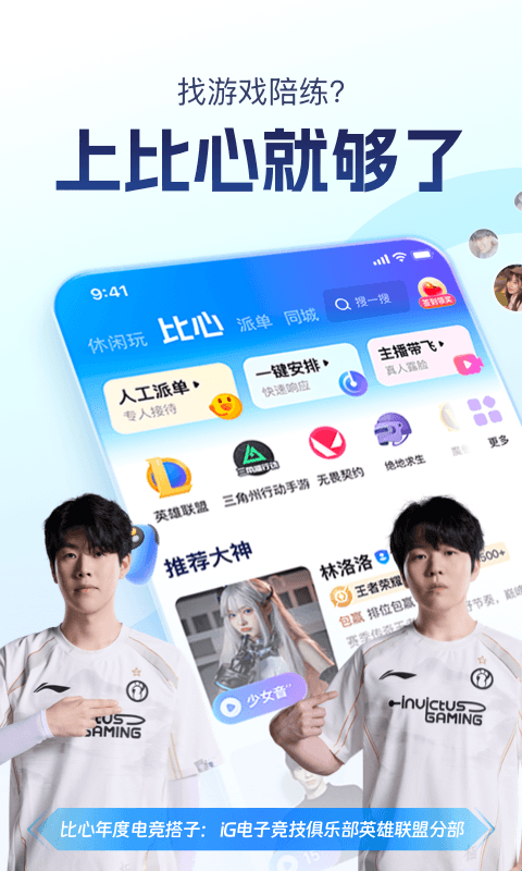 比心APP拥有众多大神队友,一键找到好听的声音,有趣有技术,带你默契上分!找英雄联盟、王者荣耀、和平精英、永劫无间、绝地求生大神队友,就上比心APP!