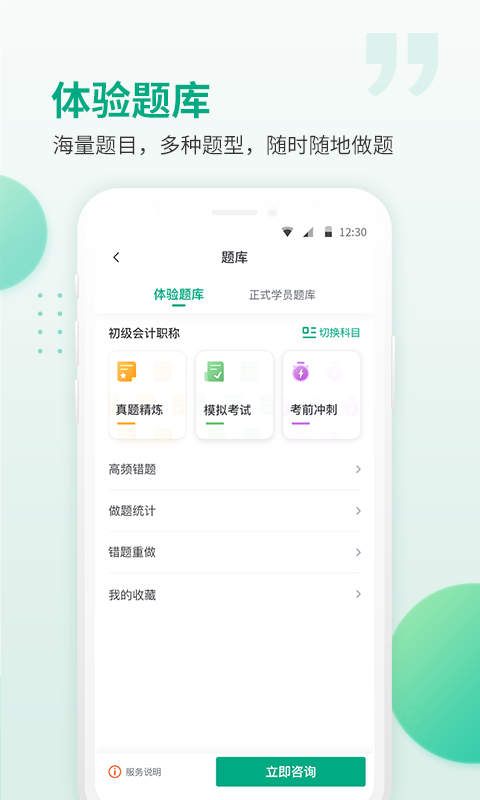 5、会计题库:我的题库、错题重做、我的收藏、做题记录、评估报告等5个功能(随堂练习、阶段考试、单科考试、模拟考试、真题密卷、高频错题等题库功能,不懂还能一键提问!)