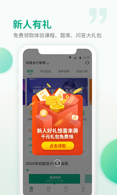 1、【新人礼包】新人专属超值惊喜课程礼包全新上线,包括免费课程、在线答疑、题库练习等福利,具体内容以实际发放为准
