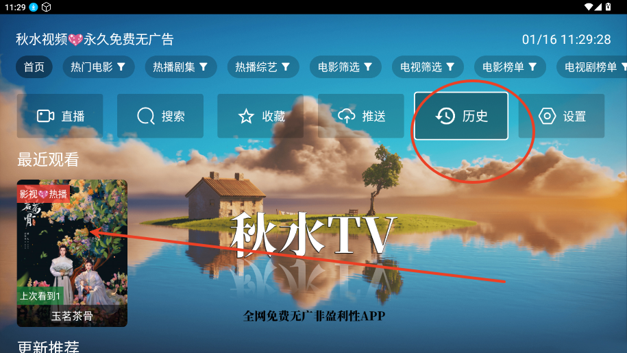 4、回到首页可以点击历史播放查看,追剧更快捷!