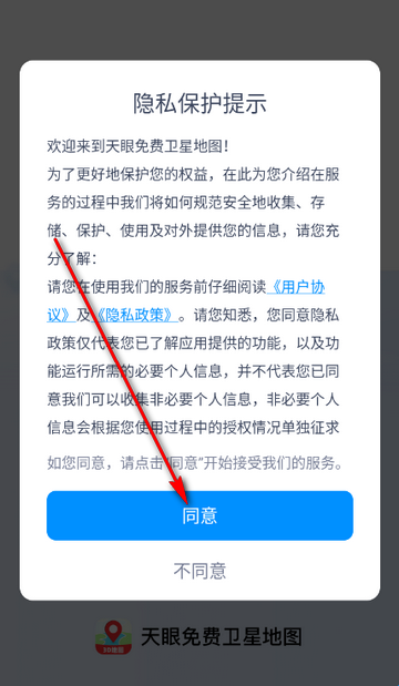 1、打开天眼免费卫星地图app,点击同意隐私政策