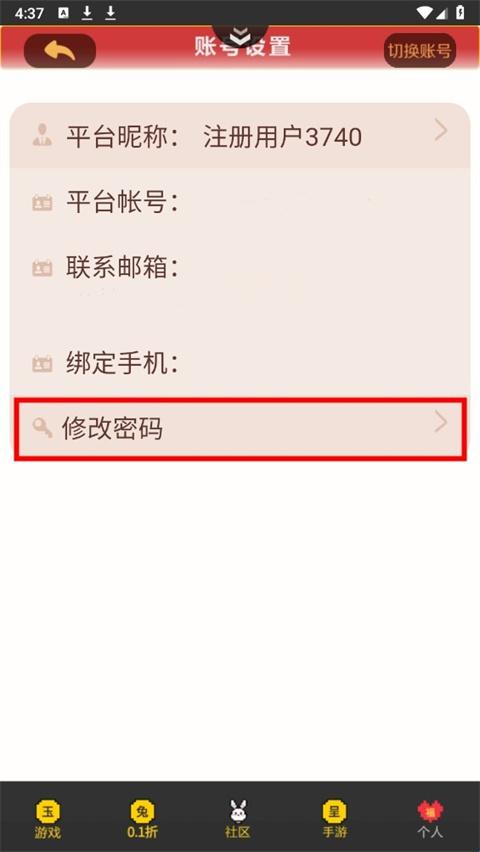 1、进入群黑游戏app首页,点击下方“个人”页面;