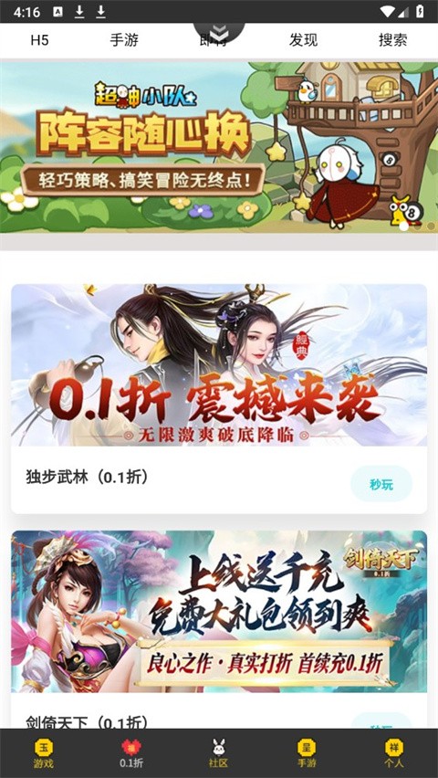 群黑游戏汇集各种类型的H5游戏,相应的也会有各种H5游戏的礼包和福利,用户可以领取,这里的社区可以了解最新游戏的资讯还可以知道一些游戏攻略,不需要下载点开就可以玩。每天签到就可以领取金币兑换奖励,还会上新游戏资源,开服预约,游戏推荐,此外,软件还提供游戏账号的买卖和游戏充值,还会优惠折扣,还有更多的福利,用户可以下载试试看!
