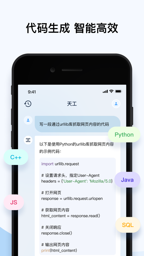 4、代码生成:具备代码生成的功能,能够根据用户的需求自动生成代码片段,并提供相应的技术支持和开发建议。对于开发人员和程序员来说,这是一个强大的工具,可以提高开发效率和代码质量。