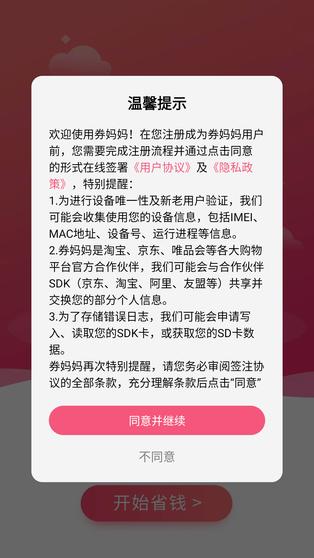 1、下载安装并打开券妈妈优惠券app,点击同意并继续