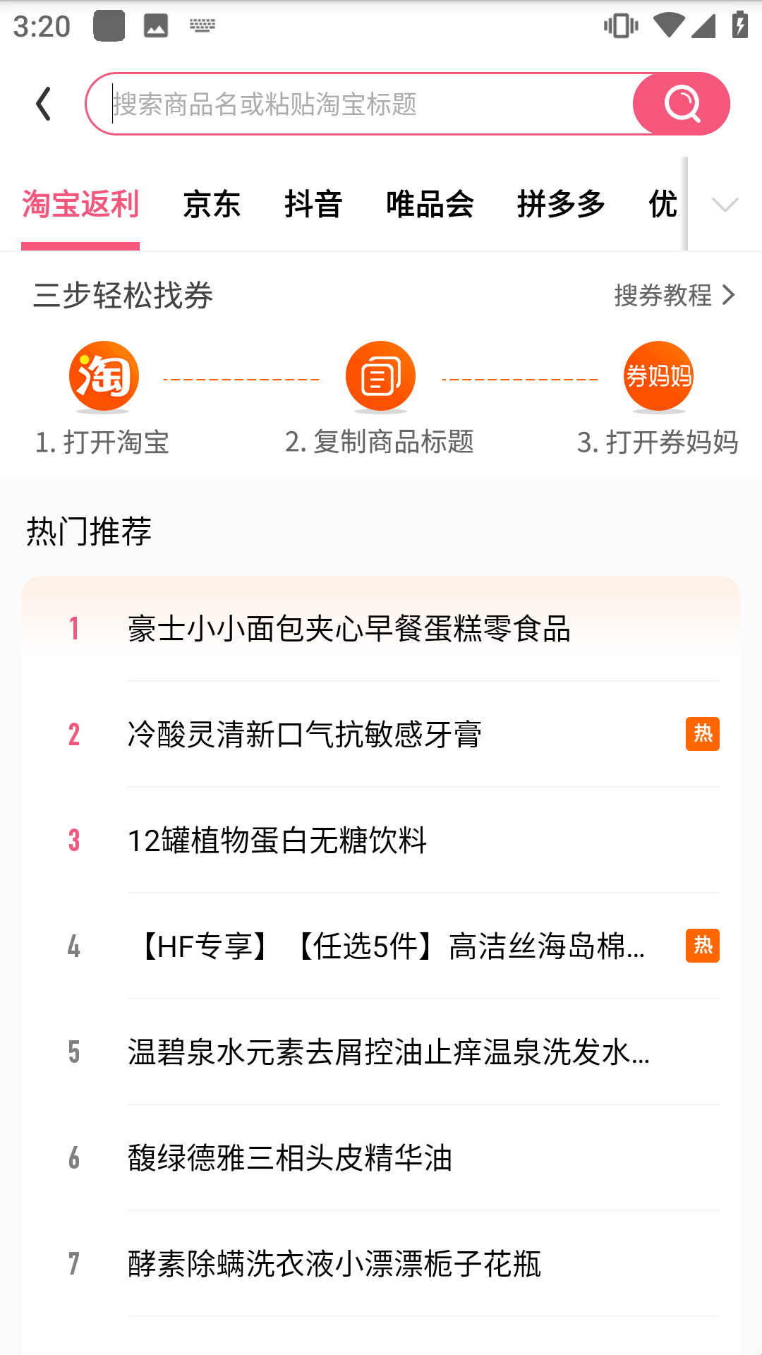 2、首页搜索框可以直接输入商品名或粘贴淘宝标题,点击搜券