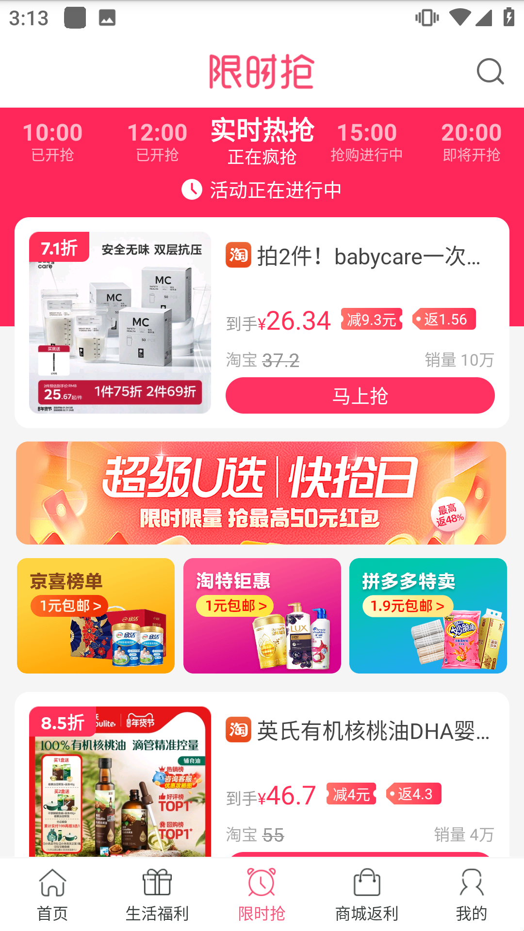 4、限时抢:新增限时抢板块,购物得大额返利,淘宝/天猫商品限量0元抢,各种好物限时抢购,抢到就是赚到。