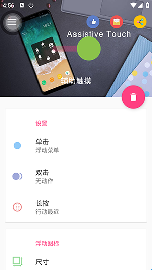 Assistive Touch的功能就类似于苹果手机的圆点,主要是可以方便大家的操作,辅助触控的软件,让你的安卓手机有ios一样的功能,帮助我们快速打开一些应用,软件还支持用户自定义系统设置,将悬浮球可以定义到任何应用的界面上,相当于APP在后台运行,您需要随时可以打开,不占据手机内存,功能包括手电筒、启动相机、开关移动数据WiFi等等,有需要的用户可以下载试试看!
