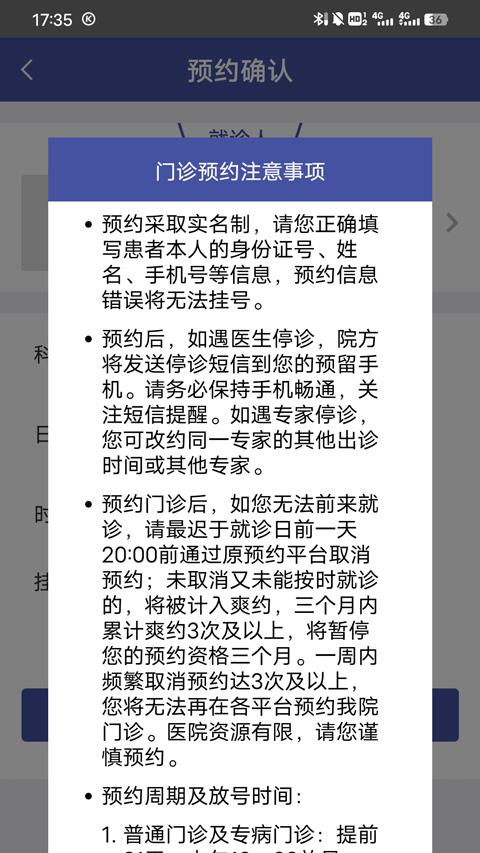 4、之后会弹跳出预约须知,玩家需要填写真实的手机号、身份证号和姓名等信息,以及取消预约需要在就诊前一天完善8点前通过原预约平台取消;