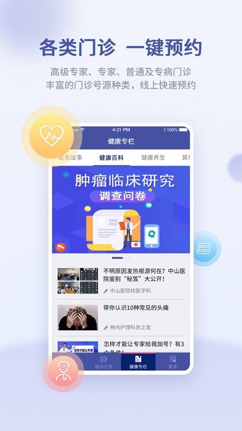 2、预约:开放更多号源种类,普通/专家/特需一键挂号。