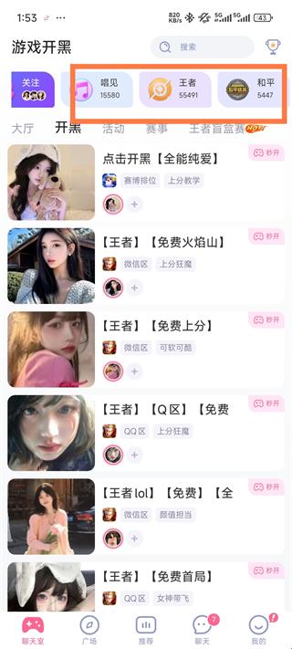 1、进入软件选择你的开黑的板块【这边以王者为例】。