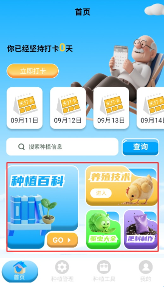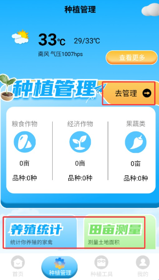 1、首先打开首页,进入页面后点击下方的“种植管理”的按钮,进入下一步。