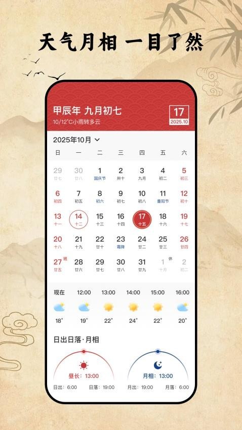 中华万年历极速版是一款功能全面的日历软件,集公历、农历、黄历与一体,用户可以快速了解每日的宜忌事项。除此之外,软件还提供实时天气功能,显示当日温度天气,并提供未来24小时的逐时天气预报,以及日出日落和月出月落时间,还有超级实用的纪念日功能,用户可以记录自己的重要的日子和待办事项。中华万年历极速版app整理界面直观简洁,占用内存小,适合经常查看天气,同时也注重黄历和记录日子的用户长期使用。