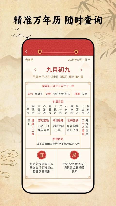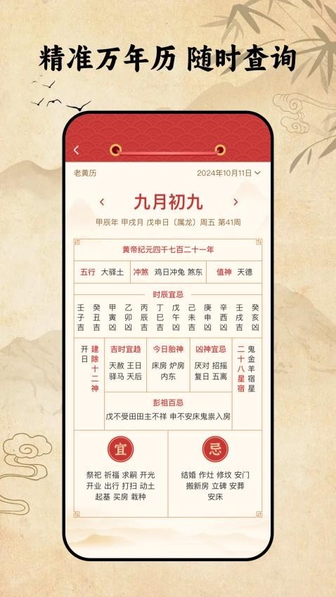 2、每日黄历宜忌:显示基于传统黄历的当日“宜”与“忌”事项指南,供日常决策参考。
