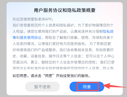 1、打开软件同意相关的协议规定。