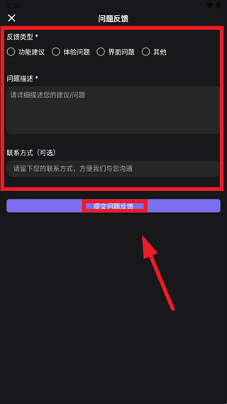 3、选择反馈类型,输入问题描述,输入联系方式,点击提交问题反馈即可