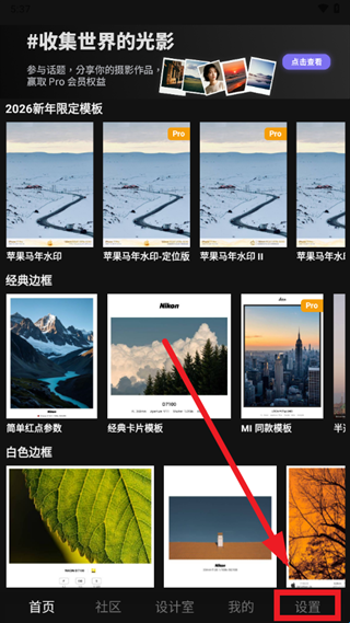 1、打开光影印记app,进入后点击设置