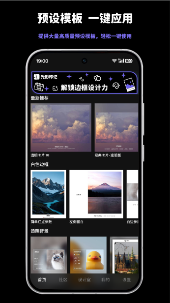 软件通过对照片diy边框的优化与水印模板的自由设计而出名,用户不仅可以为自己的美照添加个性化水印,还能通过添加不一样的边框,获得与众不同的照片质感。其实如果用户是新手小白也没关系,软件提供大量的预设模版供一键成片。用户可以随心所欲设计自己的边框照片,启发自己的摄影灵感,做最好的自己。