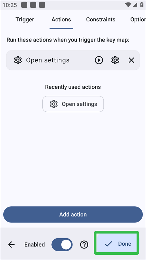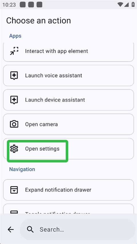 5、软件给出很多动作,在此我们选择【Open settings】打开设置,用户也可以下滑选择其他动作。