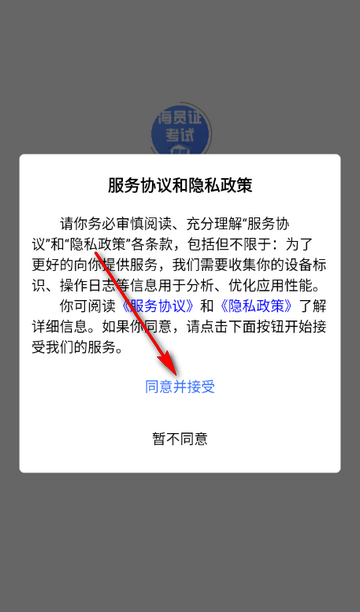 1、打开海运两员考试题峰app,点击同意隐私政策