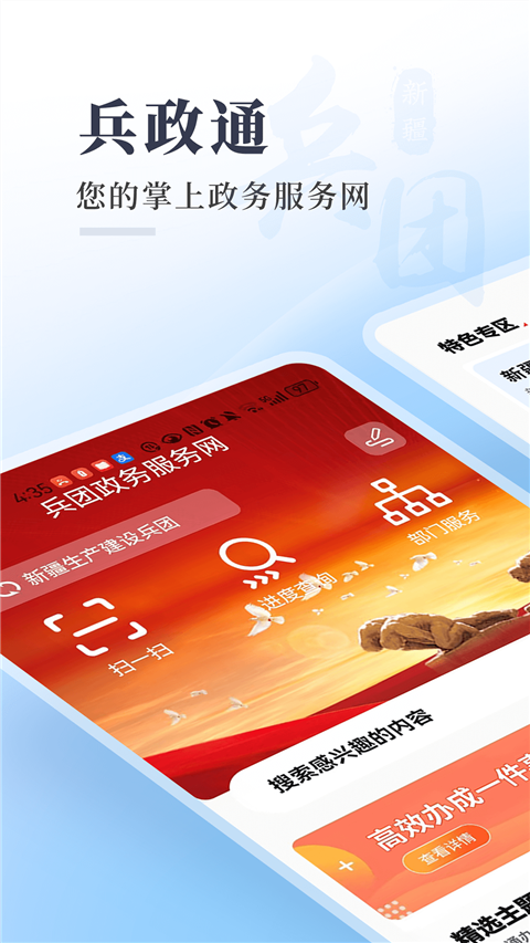 新疆兵政通app是一款兵团政务服务网软件,新疆兵政通app可以在线申报、结果查询和办事预约等功能,内容详细,功能齐全,除政务服务以外,也囊括了公民们日常生活衣食住行等特色化服务,有需要的小伙伴们快来下载体验吧!