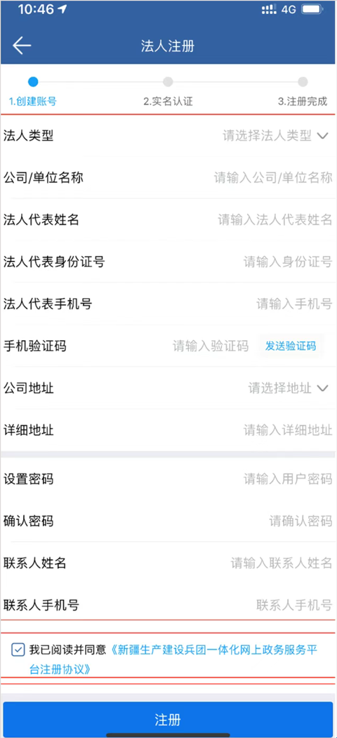 2、法人注册:法人注册填写真实法人类型、公司/单位名称、法人代表姓名、法人代表身份证号、法人代表手机号、公司地址、详细地址等信息完成注册。