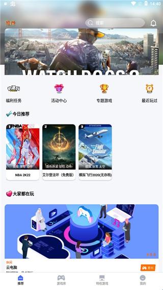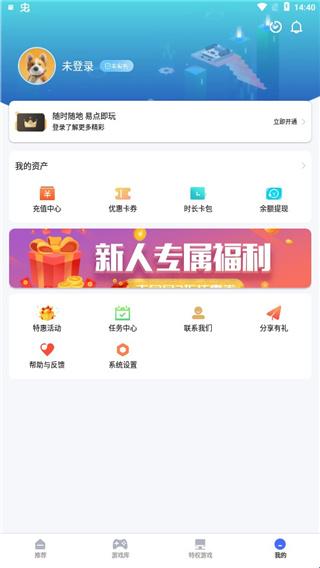 1、在本站下载安装并打开易点玩云游戏,进入软件首页,用户可以看到福利任务,活动中心,专题游戏等快捷入口。