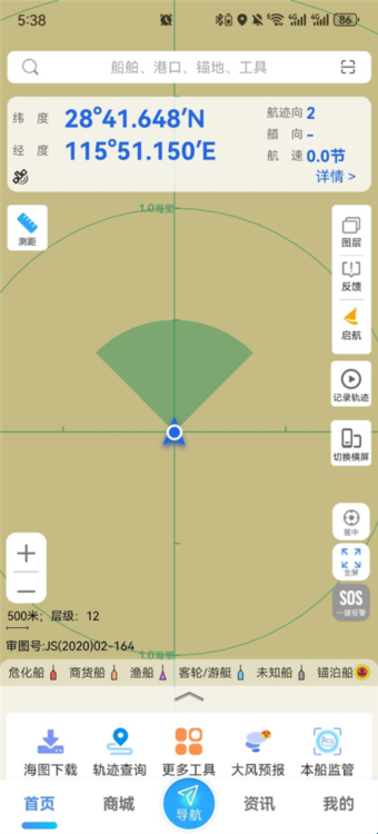 点击首页-图层,即可一键开启渔区、方向传感器。