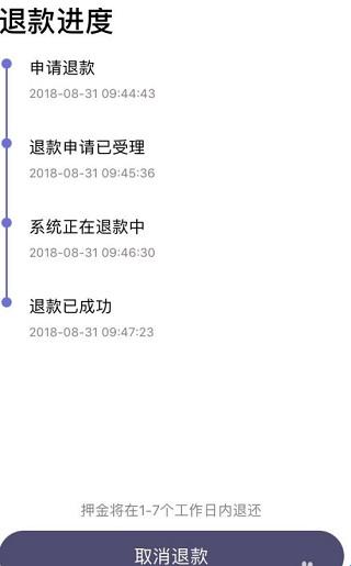 5、申请退还押金后,可在“我的钱包”->“押金”界面查看退款进度。也可以取消退款继续使用叮达出行。