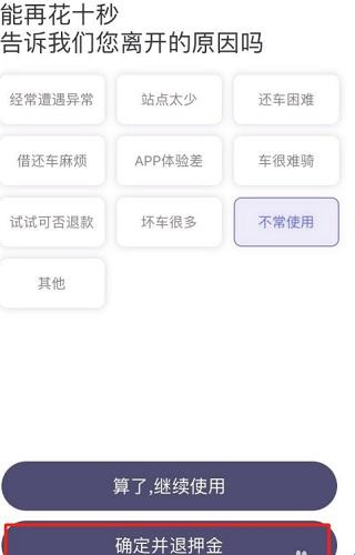 4、随便选择一个原因,点击确定并退回押金。