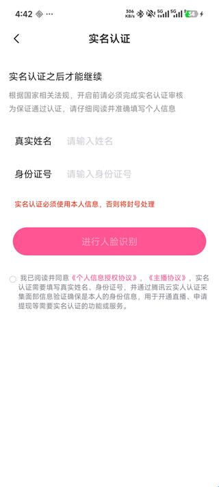 3、在创建房间之前我们需要进行实名认证,输入相关信息,随后勾选“我已阅读...”,再点击“进行人脸识别”。