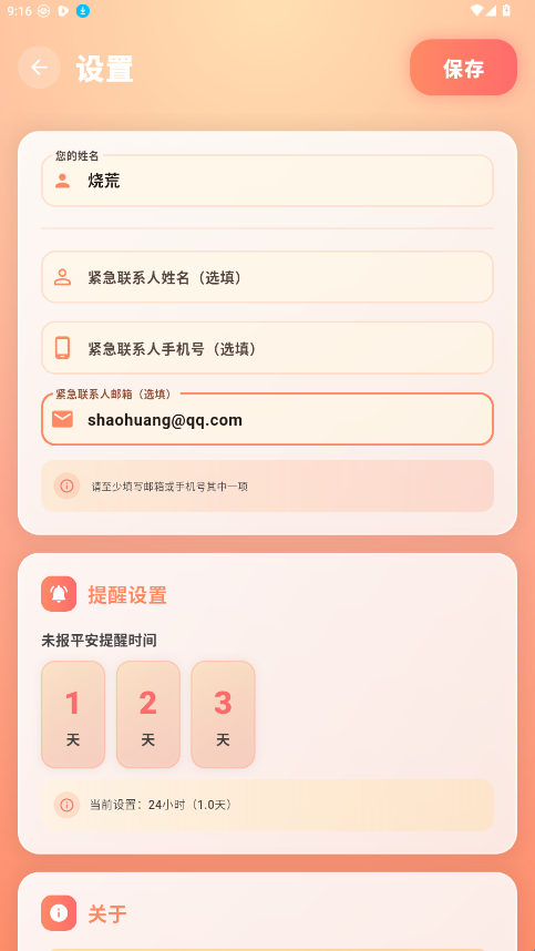 2、会直接进入设置页面,输入姓名,紧急联系人及手机或者邮箱其中一项。
