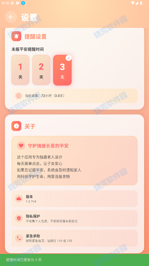最近火出圈的死了么app同款安卓应用出来了,还活着app,界面颜色更鲜艳,功能更丰富,名字更吉利,同时支持修改天数,1到3天可随意切换,支持手机号或者邮箱提醒,非常方便,无感守护,不用监控,也不追踪就是一张默默守护的平安符,兼容性极好,欢迎免费下载。