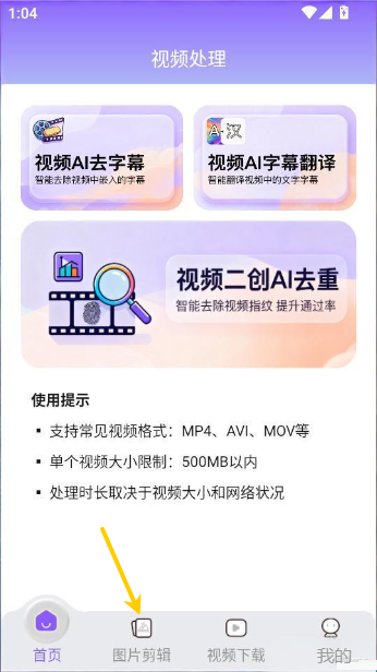 1、进入软件的首页界面后,在底部菜单栏中点击“图片剪辑”按钮来进行下一步。